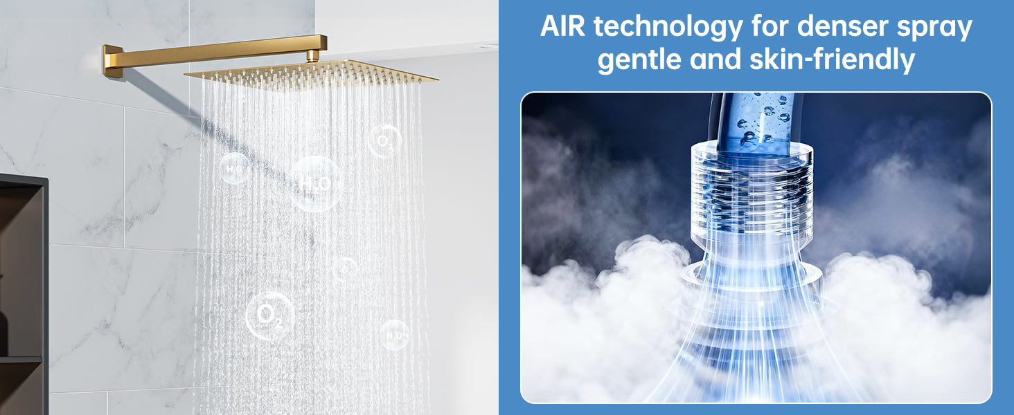 - Featuring cutting edge air injection technology, this rainfall shower head fully blends water with air to deliver double the water pressure, recreating the comfortable feel of natural rain. The shower head panel is reinforced with double the thickness, ensuring stability and durability even under high pressure conditions. While delivering powerful water pressure, it also saves 30%-50% on water usage perfect for households with low water pressure.