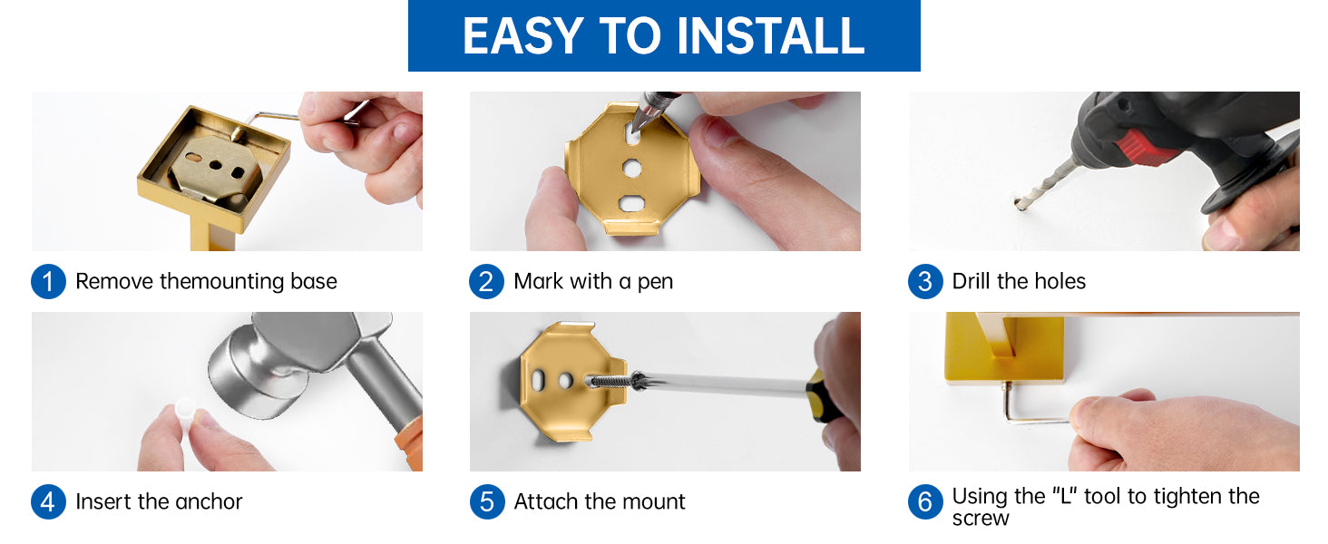 - The gold bathroom accessories set package comes with built-in installation instructions, hidden screw mounts, we provide all the screw accessories needed for installation in the package, no need to worry about how to install it, we will provide you with the installation instruction manual.