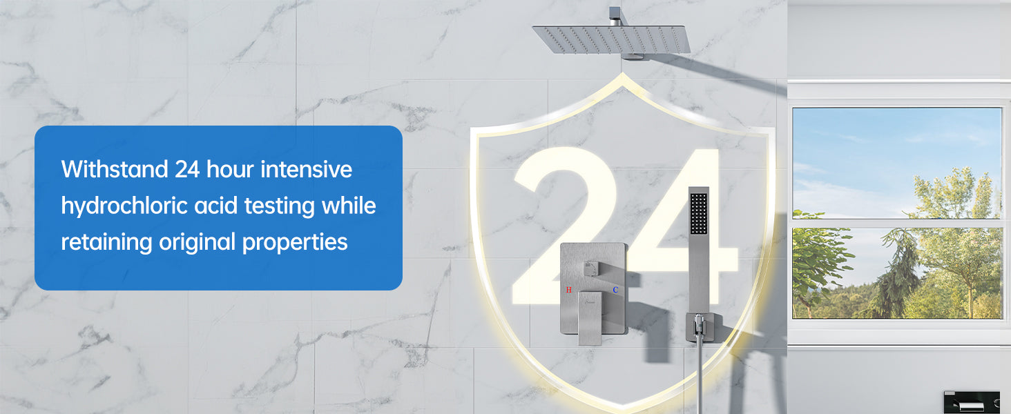 - The entire shower system is crafted with a full metal structure. The mixing valve is made of solid brass, preventing rust from the start and extending the product’s service life. The shower head is constructed from SUS304 stainless steel, paired with self-cleaning silicone nozzles. This design not only prevents clogging and enables easy cleaning but also effectively resists oxidation and corrosion, keeping the shower faucet set looking.