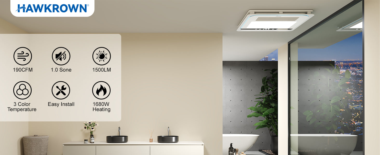 - HAWKROWN bathroom exhaust fan adopts 4-in-1 design. The exhaust fan, light, heater and ventilation fan can work independently or together to provide excellent ventilation, reduce odor and improve the overall comfort of the bathroom. The wall remote control can quickly control the functions you need.