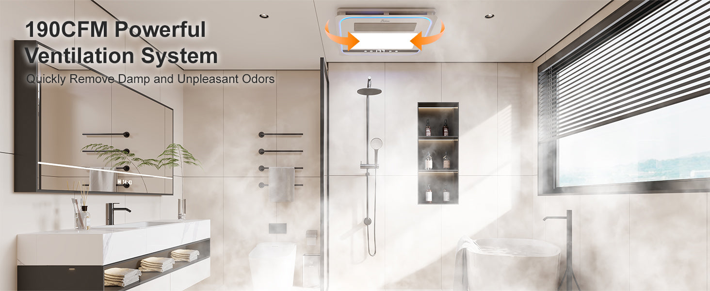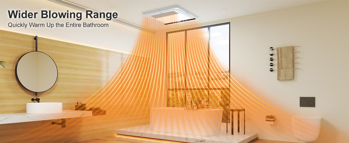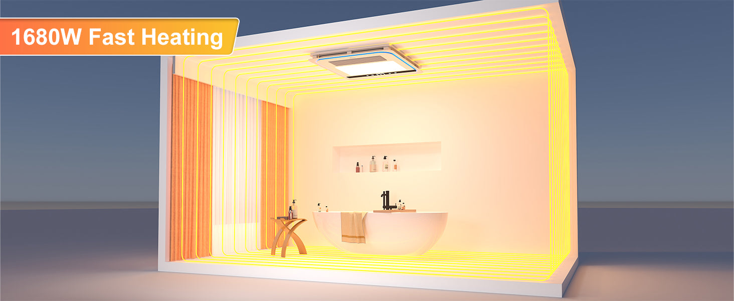 - Our bathroom exhaust fan is equipped with a powerful 1780 W heater to provide effective heating for your entire room. Also features LED lighting, the bright 1200lm LED light will illuminate your entire bathroom.