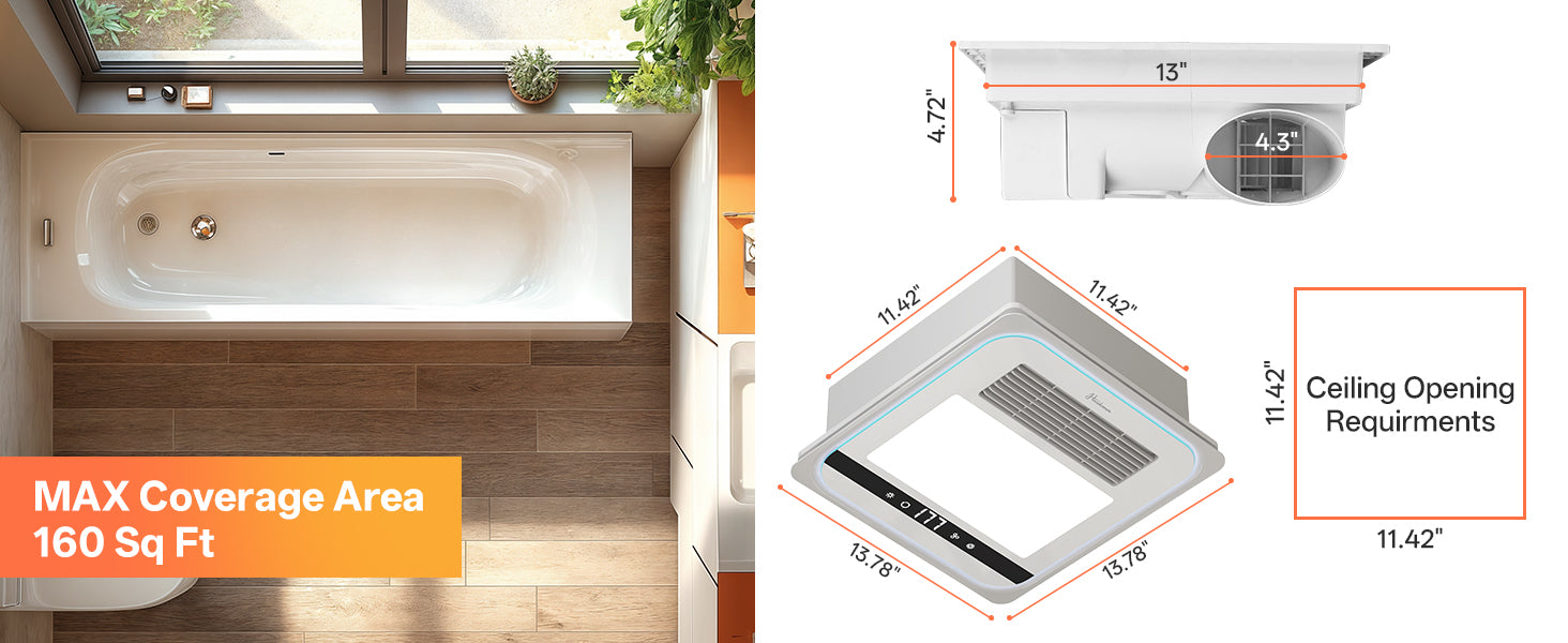 - This bathroom fan fits a 11.42" x 11.42" ceiling structure, and the LED light cover measures 13.78"x13.78". Simply install the bathroom exhaust fan between the ceiling joists and snap it directly onto the ceiling joists. The duct diameter is 4.3", please confirm the size before purchasing.