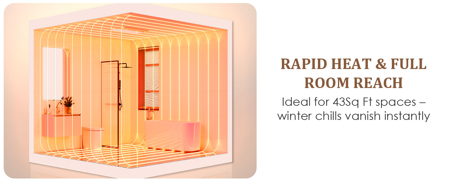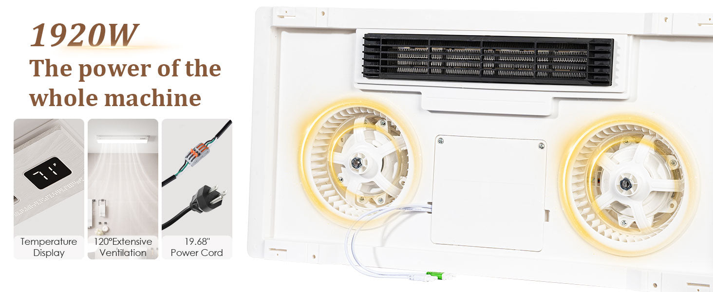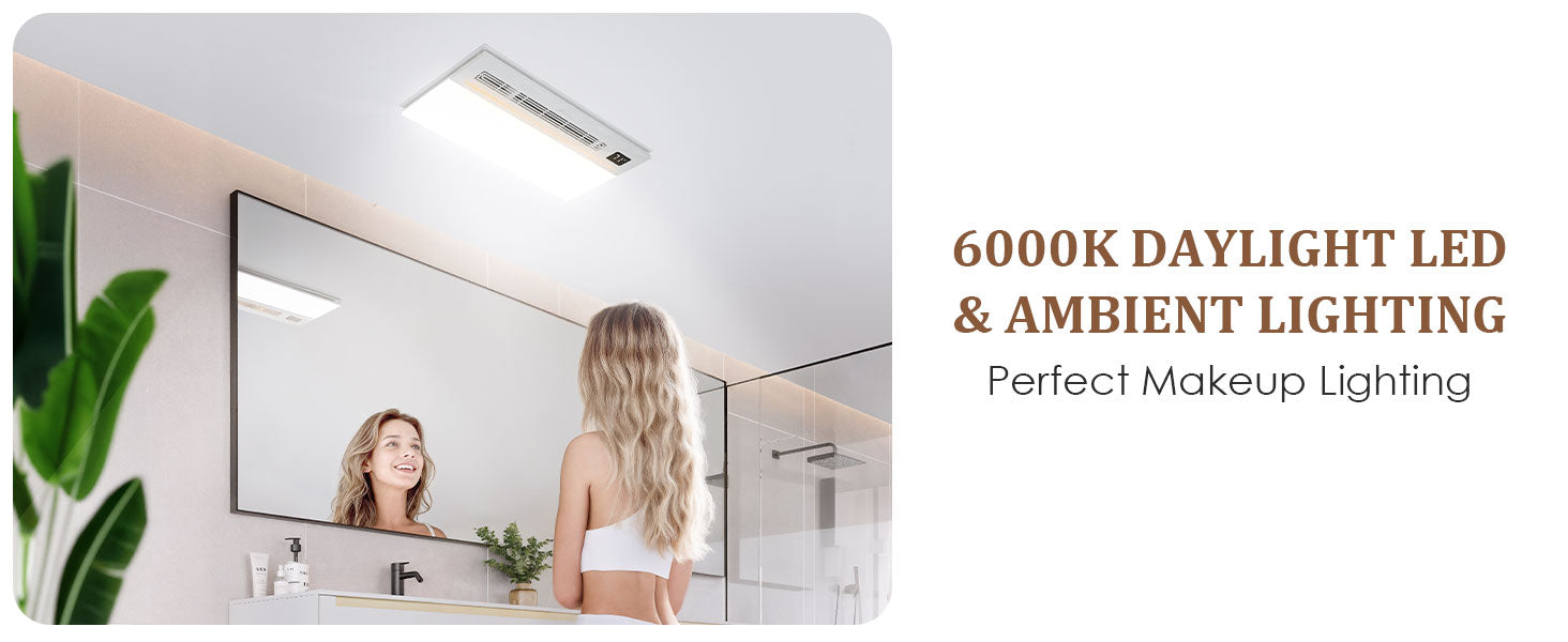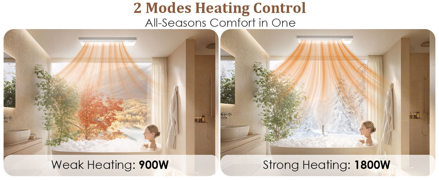 - Our bathroom exhaust fan is equipped with a powerful 1800W heater which utilizes a custom ceramic PTC heating block for fast and efficient warmth. Dual heat levels meet varied seasonal needs for optimal comfort. Also features LED lighting, the bright 2600lm 6000K LED light will illuminate your entire bathroom.