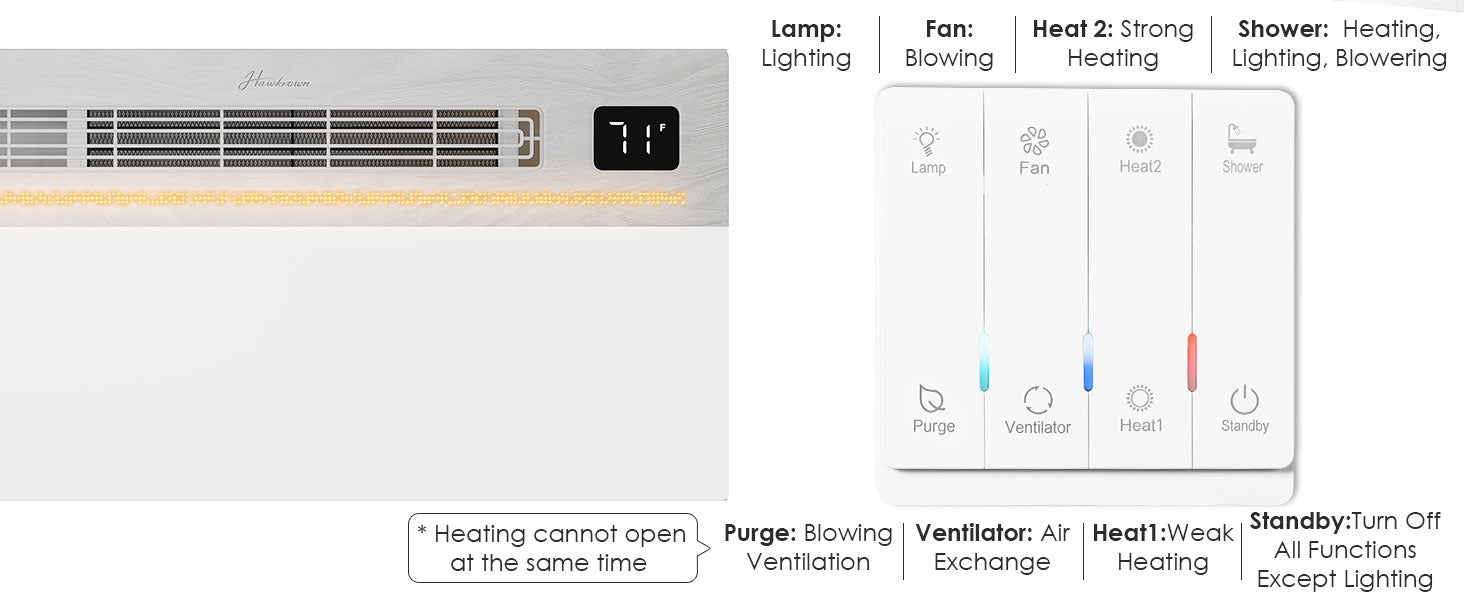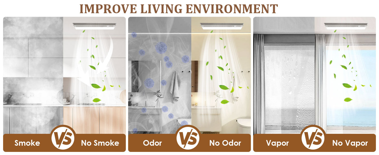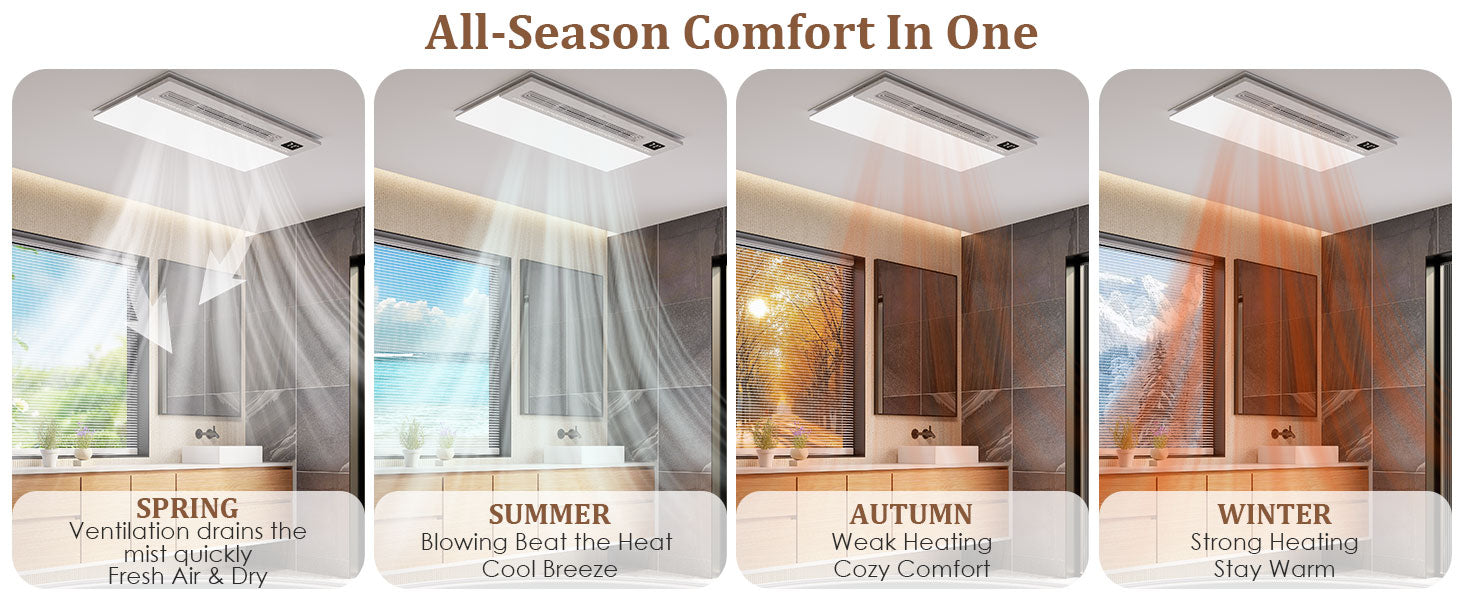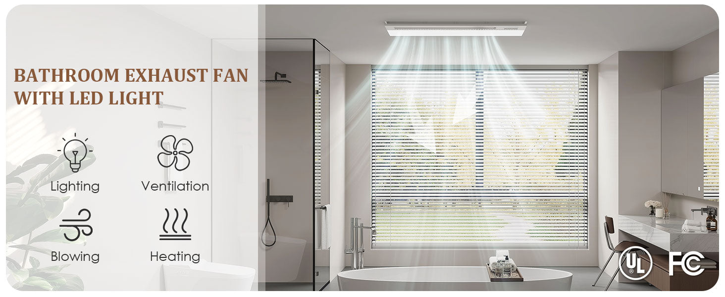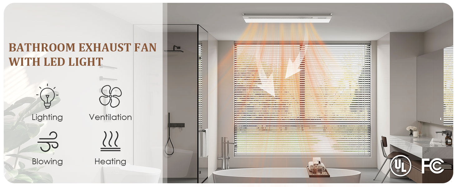 - This advanced bathroom exhaust fan integrates lighting, ventilation, heating, and air blowing to enhance your bathroom experience in every season. Features a glossy acrylic front panel accented with a wood-grain hollow ambient light, adding visual depth and elegance to your space.