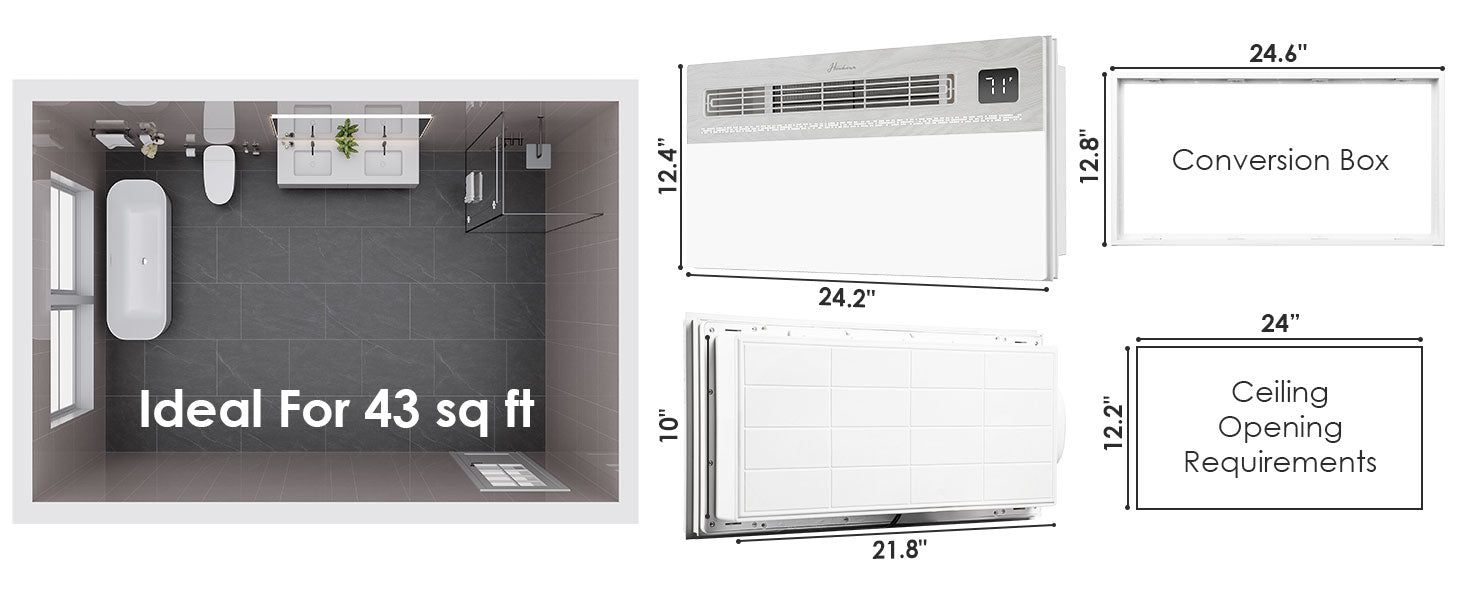 - This bathroom fan fits a 24" x 12.2" ceiling structure, and the LED light cover measures 24.2"x 12.4" . Simply install the bathroom exhaust fan between the ceiling joists and snap it directly onto the ceiling joists. The duct diameter is 5.11", please confirm the size before purchasing.
