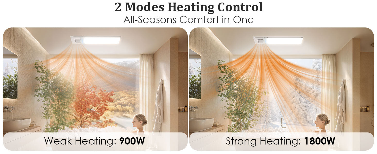 - Our bathroom exhaust fan is equipped with a powerful 1900W heater which utilizes a custom ceramic PTC heating block for fast and efficient warmth. Dual heat levels meet varied seasonal needs for optimal comfort. Also features LED lighting, the bright 2600lm 6000K LED light will illuminate your entire bathroom.