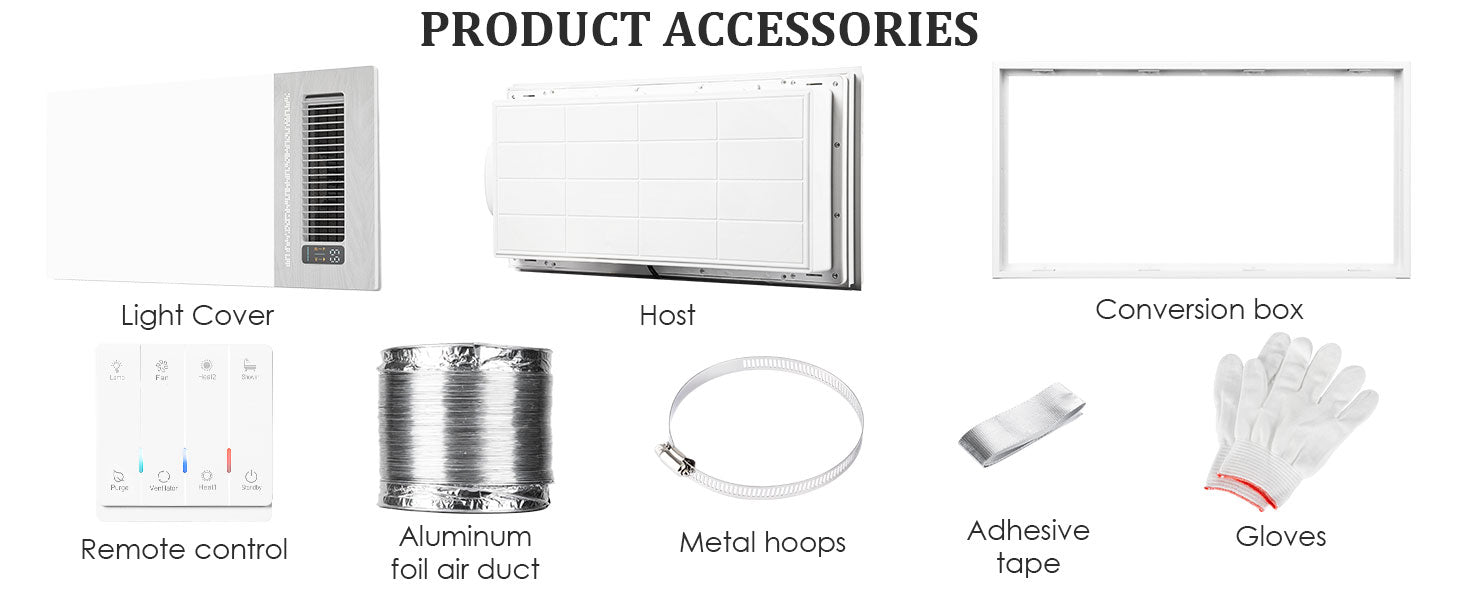 - Package includes 1*Bathroom Exhaust Fan (Casing and Exhaust Panel are separate), 1*Duct Adapter, 1*remote control, 1*User Manual. Bathroom Exhaust Fan with Light is perfect for places that need to remove humid air. Tips: 12-month warranty is provided. If you encounter any problems when using our bathroom fan, please contact us.