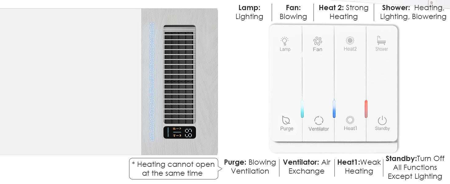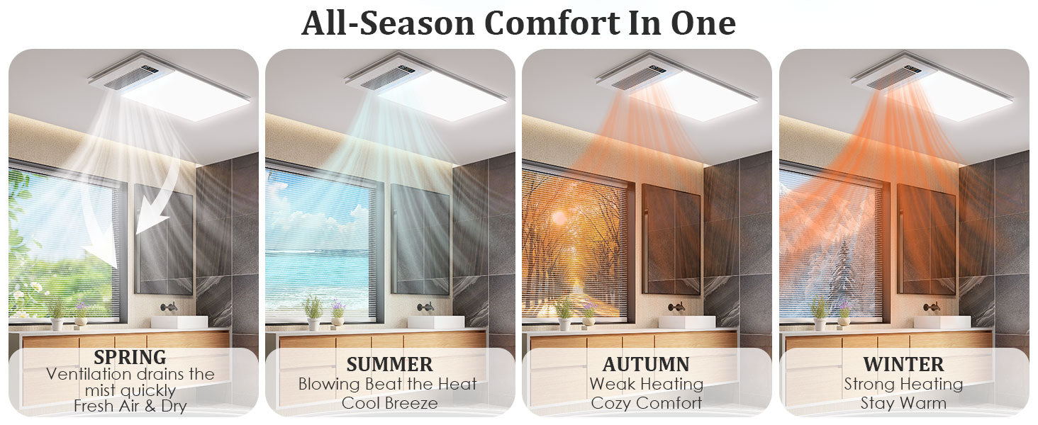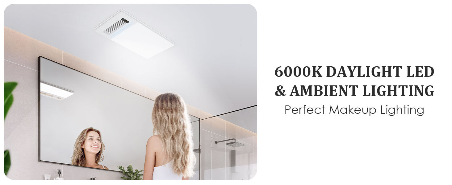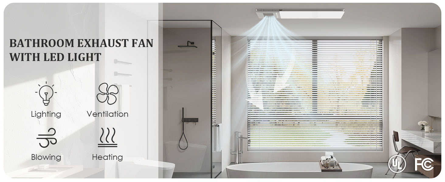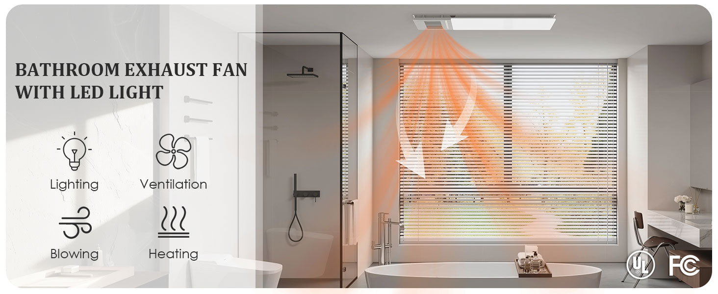 - This advanced bathroom exhaust fan integrates lighting, ventilation, heating, and air blowing to enhance your bathroom experience in every season. Features a glossy acrylic front panel accented with a wood-grain hollow ambient light, adding visual depth and elegance to your space.