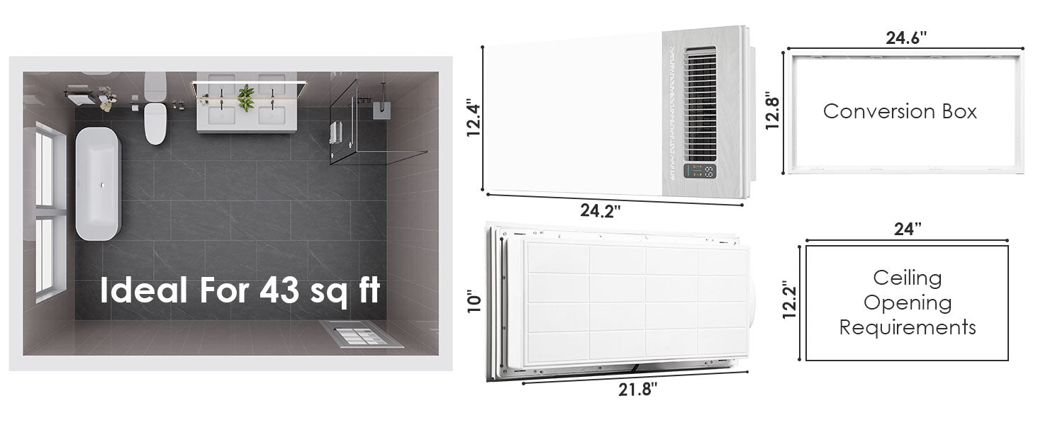 - This bathroom fan fits a 24" x 12.2" ceiling structure, and the LED light cover measures 24.2"x 12.4" . Simply install the bathroom exhaust fan between the ceiling joists and snap it directly onto the ceiling joists. The duct diameter is 5.11", please confirm the size before purchasing.