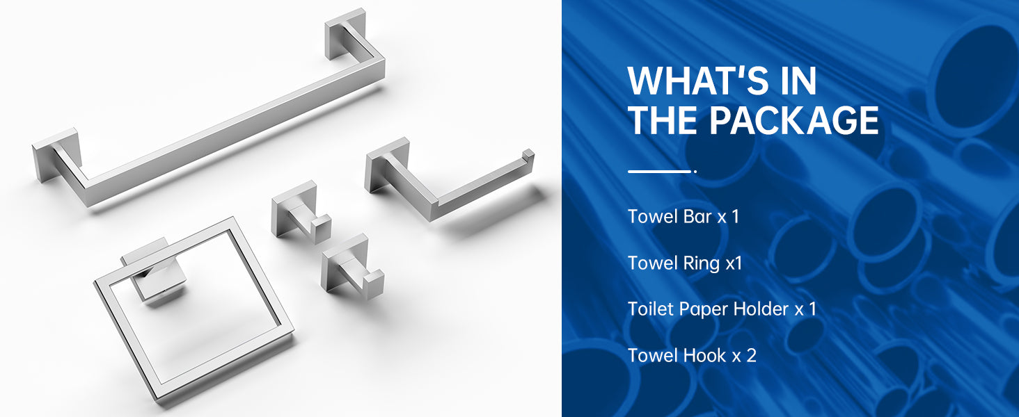 - This bathroom accessory set contains 23.6 inch towel bar, toilet paper holder, 1 towel ring, 2 multifunctional hooks. We are committed to providing the best service to our customers. If any problem occurs during use, please contact us immediately and we will help you solve it immediately.