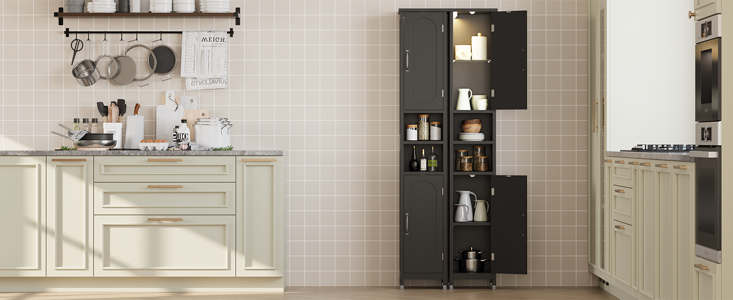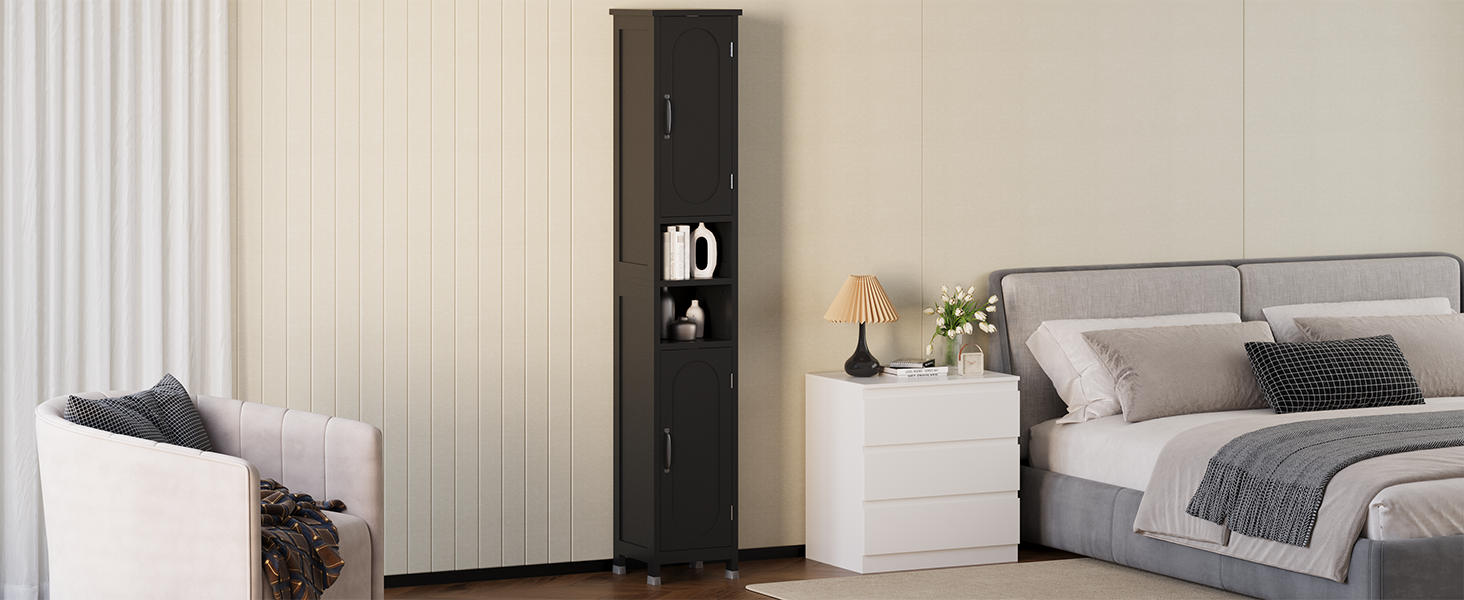 - Still troubled by the difficulty of fitting items of different sizes into the slim cabinet? Our tall bathroom cabinet has a total of 6 compartments inside, three of which are adjustable shelves. This allows you to flexibly create a storage system that suits your needs according to the size of your items, and easily organize all your essential bathroom items.Plus, it comes with foot pads that protect floors and keep the cabinet stable, making it perfect for organizing your bathroom essentials.