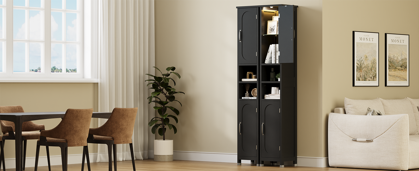 Perfect for small spaces! This tall bathroom cabinet is sleek, sturdy, and well-designed with adjustable shelves and built-in lights. It provides excellent storage without taking up much room. Great quality and easy to assemble. Highly recommend!