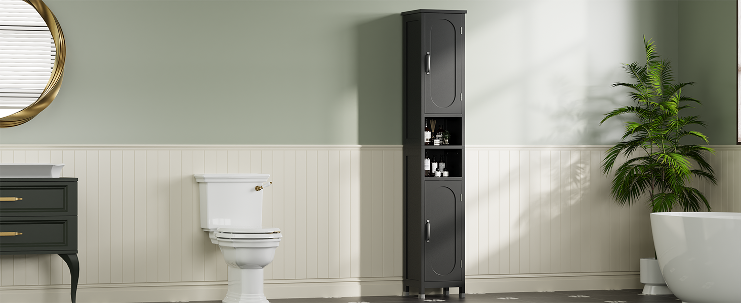 - Our tall bathroom cabinet offers dual installation flexibility, allowing you to customize the door swing to either the left or right based on your bathroom layout and personal preference. Whether your space requires a left-opening or right-opening design, this cabinet adapts seamlessly to fit your needs, ensuring maximum convenience and functionality. Perfect for tight spaces, this feature makes it easier to access your essentials without compromising on style or comfort.