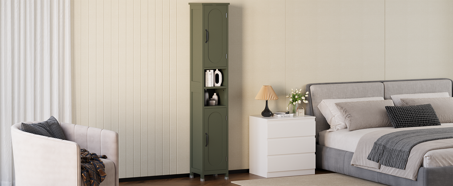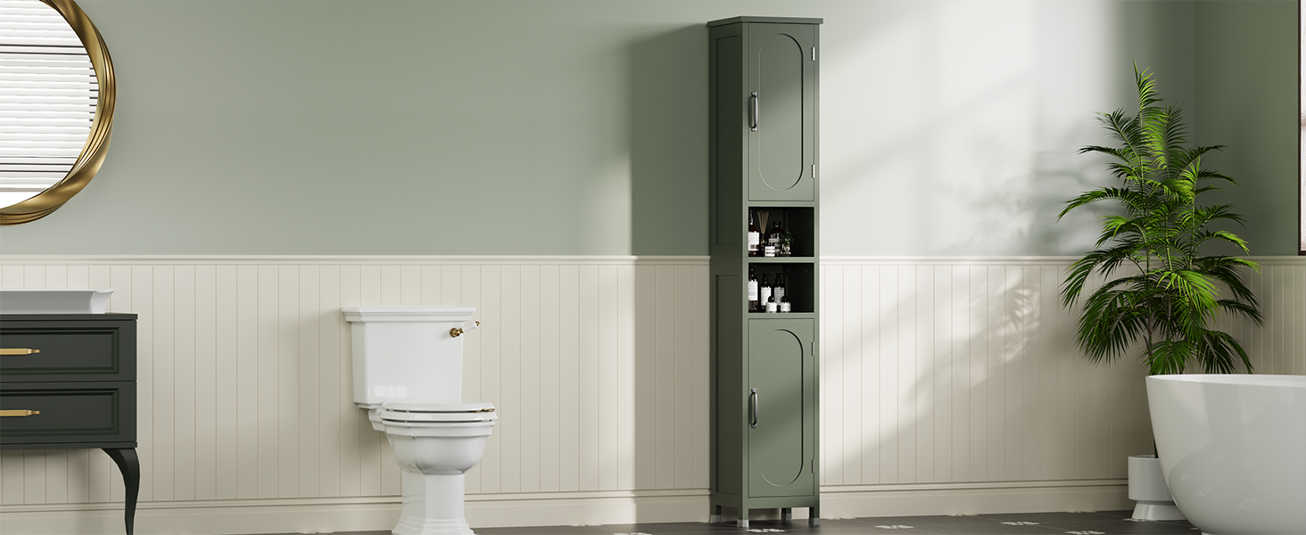 - Still troubled by the difficulty of fitting items of different sizes into the slim cabinet? Our tall bathroom cabinet has a total of 6 compartments inside, three of which are adjustable shelves. This allows you to flexibly create a storage system that suits your needs according to the size of your items, and easily organize all your essential bathroom items.Plus, it comes with foot pads that protect floors and keep the cabinet stable, making it perfect for organizing your bathroom essentials.