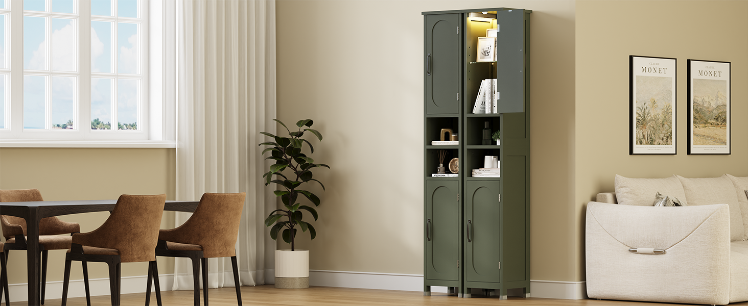 67" Tall Bathroom Storage Cabinet with Lights, Slim Narrow Bathroom Cabinet Organizer with Doors and Adjustable Shelves, Tall Cabinet for Small Space, Living Room (Green)