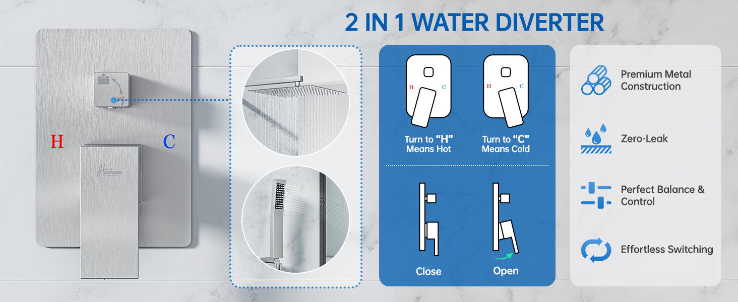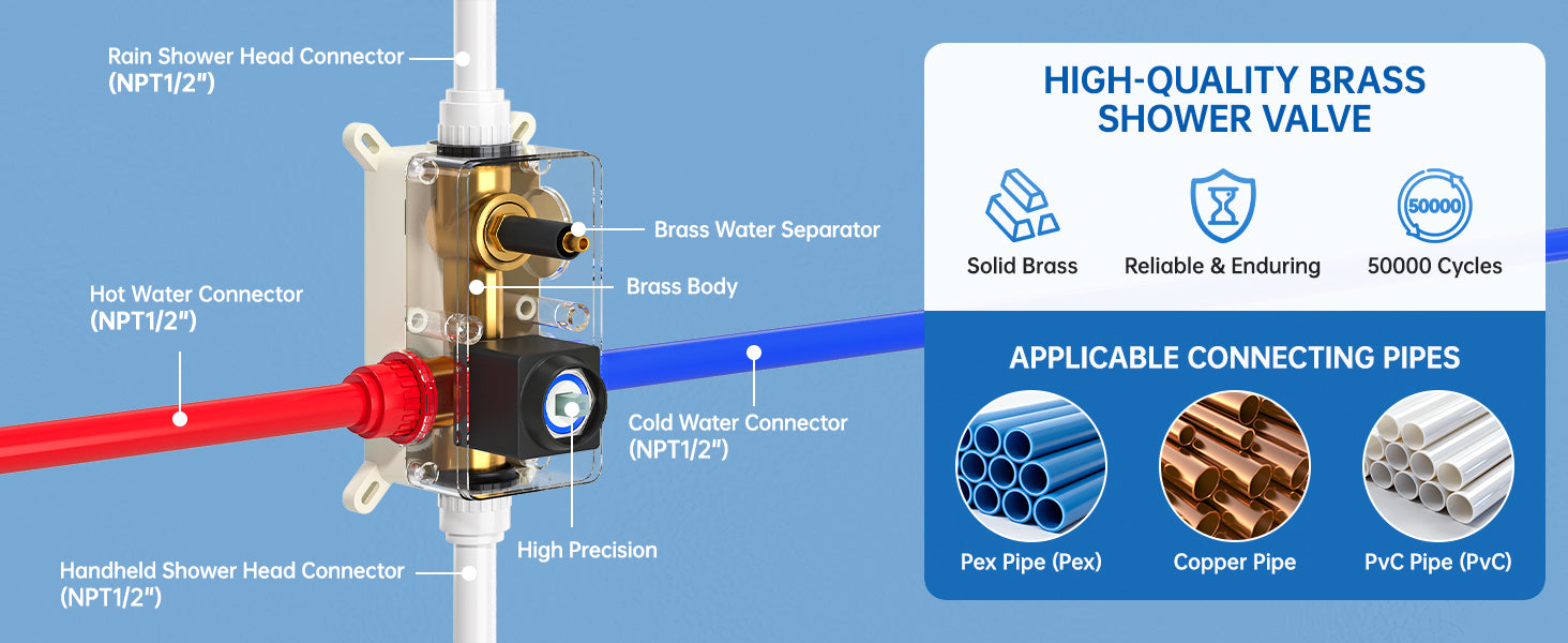 - The pressure balanced valve core is built with two internal check valves that continuously monitor and balance water pressure, while precisely handles sudden fluctuations in hot and cold water temperatures, eliminating the risk of scalding at the source. Compatible with standard 1/2-inch US pipe connections, it maintains a stable water flow rate of 1.78 Gallons Per Minute (6.7L/min), balancing energy efficiency and optimal user experience.