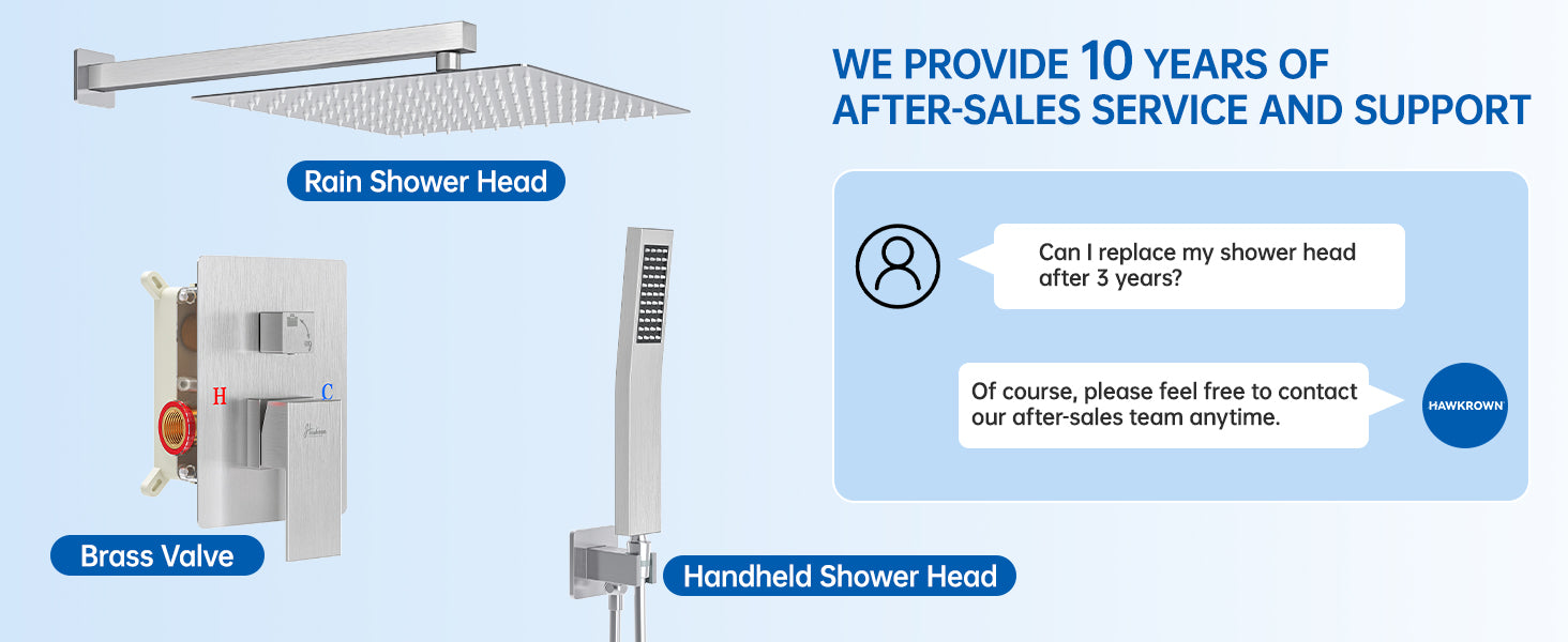 - All components of our shower system are designed for easy replacement, and we offer an extended warranty: core parts come with a 5-year limited warranty, while the valve core is covered for an even longer 10-year warranty. If any part fails due to quality issues during the warranty period, you are eligible for a free replacement. For any inquiries, our professional team will respond within 12 hours to ensure a completely worry free user experience.