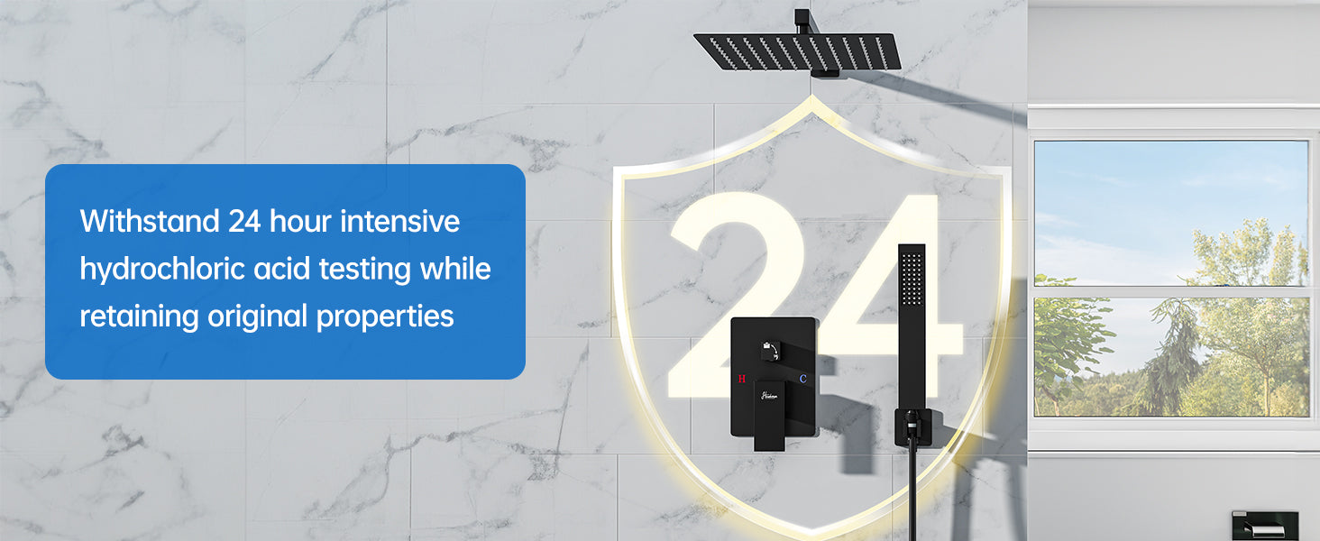 - The entire shower system is crafted with a full metal structure. The mixing valve is made of solid brass, preventing rust from the start and extending the product’s service life. The shower head is constructed from SUS304 stainless steel, paired with self-cleaning silicone nozzles. This design not only prevents clogging and enables easy cleaning but also effectively resists oxidation and corrosion, keeping the shower faucet set looking.