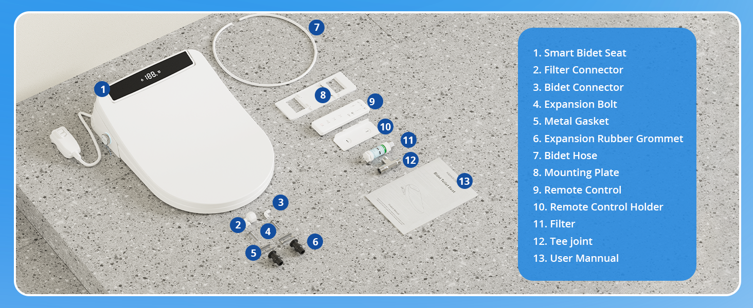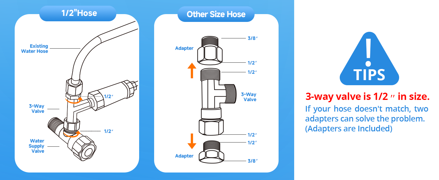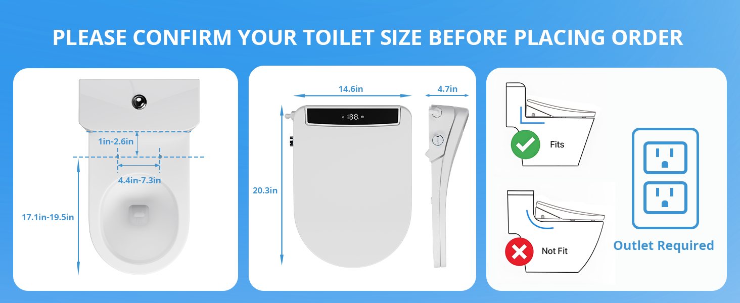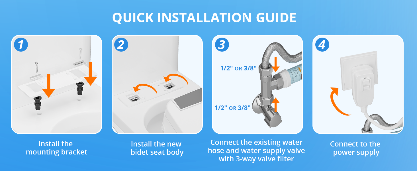 - Our electric bidet toilet seat features a standard 1/2 inch tee fitting and two 1/2" - 3/8" adapters,Please note that the tee fitting should be installed on the water supply valve, and please confirm that the size of your water supply valve interface is 1/2" or 3/8".