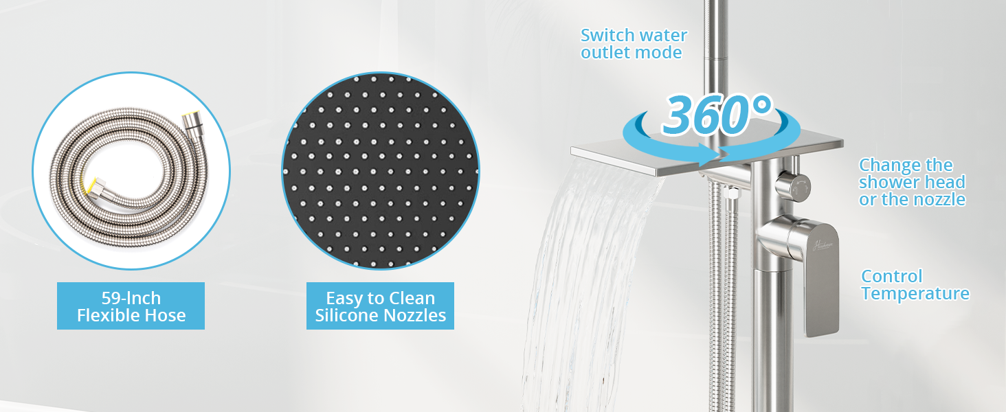 - The gooseneck design of this freestanding bathtub faucet is easy to use, featuring a 360-degree swivel spout for increased flexibility when you are showering or bathing. The injected bubble design injects air into the water stream to increase the comfort of the water flow while showering.This floor standing bathtub faucet has a handheld shower with a 59 inch shower hose with a diverter knob that allows you to switch between the tub spout and the handheld shower.