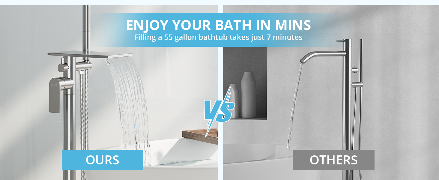 - HAWKROWN floor standing bathtub faucet has a max flow rate of up to 7.4 GPM and the hand shower has a max flow rate of 2.8 GPM, which will fill your bathtub in the fastest time possible.It takes approximately 7.4 minutes to fill a 55 gallon single person bathtub.Drain the water for 30-60s before installation to avoid clogging of debris in the water pipe and prevent water from coming out.