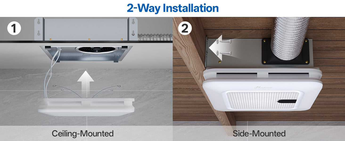 - Fits 11.22" x 11.22" ceiling openings, comes with a 3.15" duct outlet and a 13" x 13" light cover, and features a spring-clip design for easier and faster installation. The unit supports plug connection or terminal wiring. All functions can be controlled with the included remote (with wall-mount holder), or through the App.