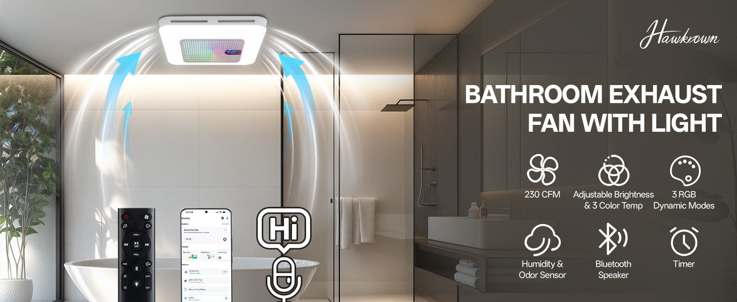 - Hawkrown smart bathroom fan with bluetooth speaker is compatible with Alexa, Google Home, Tuya App allowing you to control the fan, speaker humidity & odor sensor and light. NETWORK SUPPORT: 2.4GHz WiFi ONLY(5GHz not supported)