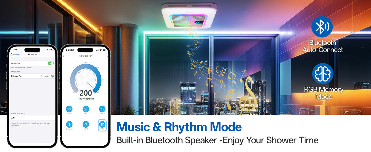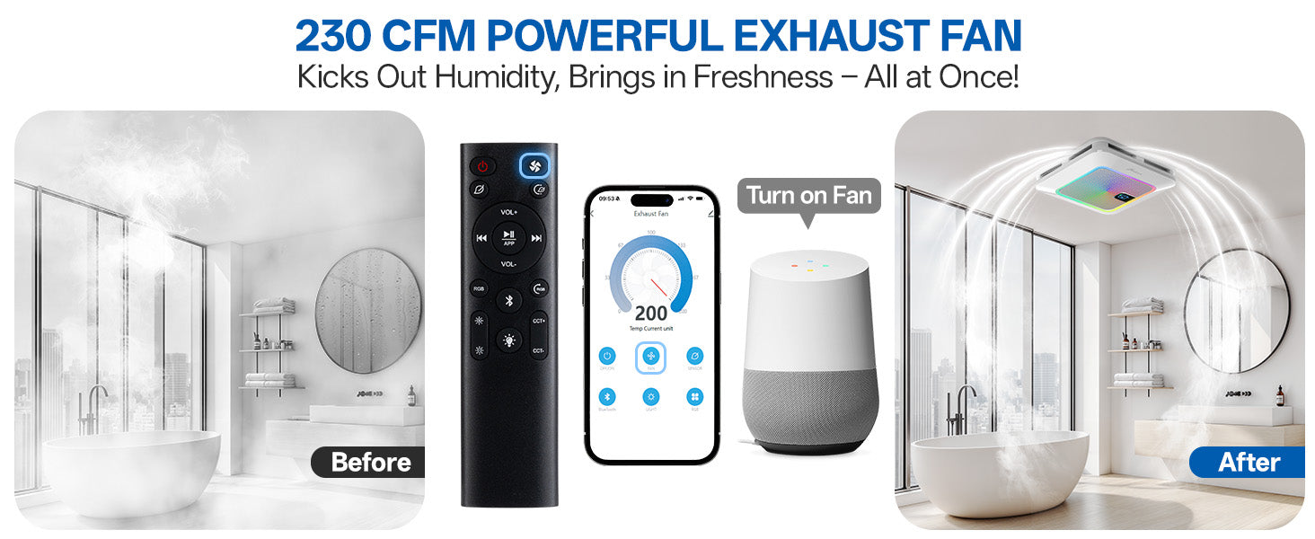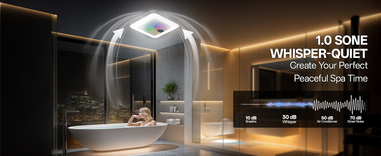 - Combines ventilation, lighting, Bluetooth sound, and smart controls into one sleek, space-saving unit. Powerful 230 CFM airflow efficiently removes moisture and odors, while the 1.0 Sone low-noise rating ensures whisper-quiet operation for a relaxing bathroom environment. An ideal upgrade for a smarter, fresher, and more stylish bathroom.