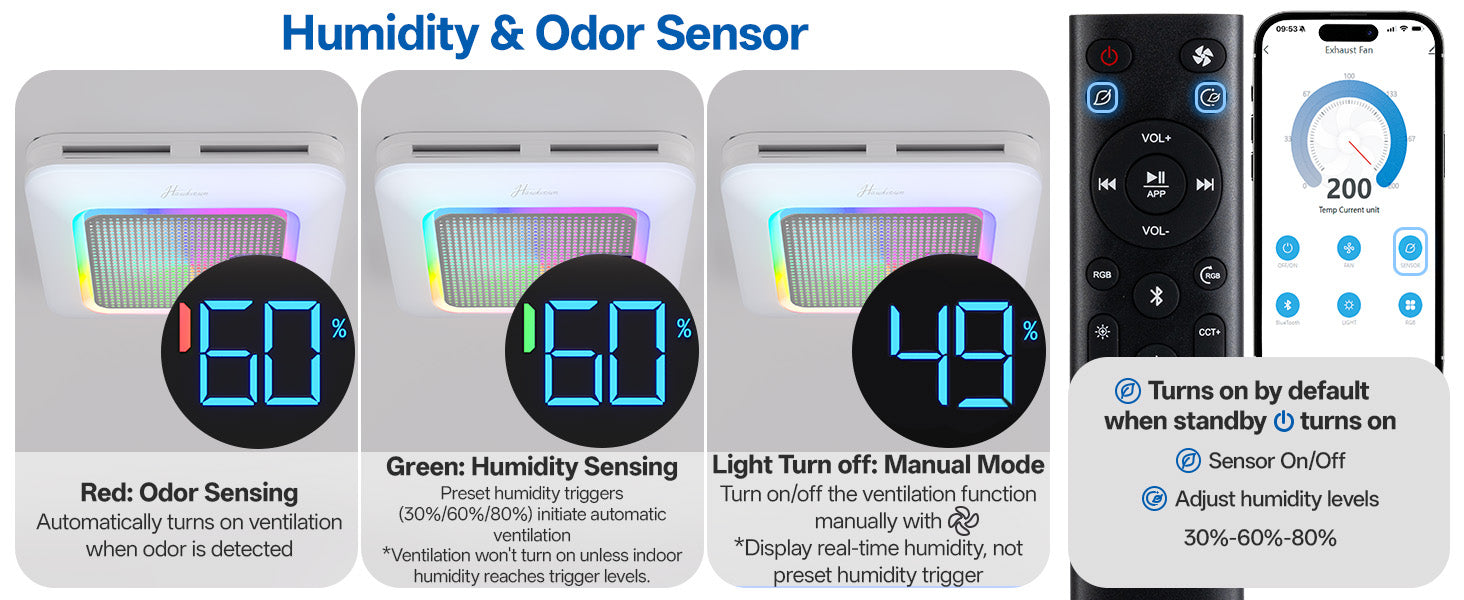 - Features dual sensors for humidity and odors. Choose between manual mode or auto-sensing mode. In auto mode, the exhasut fan activates when humidity reaches preset levels (30%, 60%, or 80%), keeping your bathroom fresh and dry. Odor detection is synchronized with humidity sensing; turning off humidity sensing also disables odor detection.