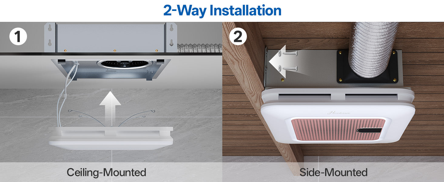 - Fits 11.22" x 11.22" ceiling openings, comes with a 3.15" duct outlet and a 13" x 13" light cover, and features a spring-clip design for easier and faster installation. The unit supports plug connection or terminal wiring. All functions can be controlled with the included remote (with wall-mount holder), or through the App.