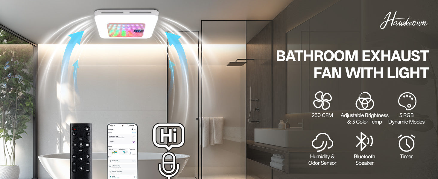- Hawkrown smart bathroom fan with bluetooth speaker is compatible with Alexa, Google Home, Tuya App allowing you to control the fan, speaker humidity & odor sensor and light. NETWORK SUPPORT: 2.4GHz WiFi ONLY(5GHz not supported)
