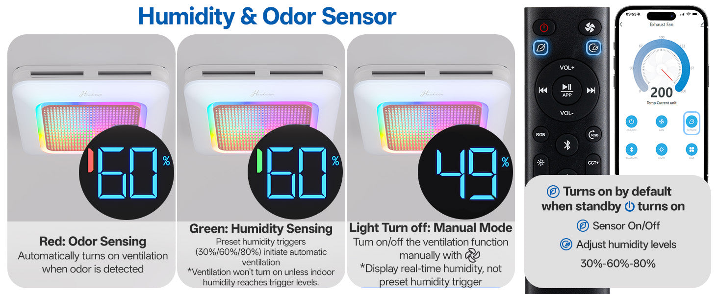 - Features dual sensors for humidity and odors. Choose between manual mode or auto-sensing mode. In auto mode, the exhasut fan activates when humidity reaches preset levels (30%, 60%, or 80%), keeping your bathroom fresh and dry. Odor detection is synchronized with humidity sensing; turning off humidity sensing also disables odor detection.