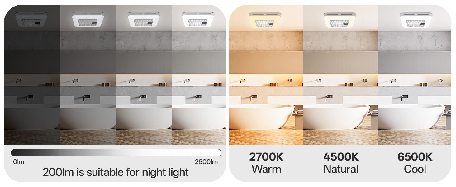- Integrated LED light with adjustable CCT 3000K-6500K for customizable brightness, plus dynamic RGB lighting with 3 motion effects for a modern, relaxing bathroom ambiance. Light and fan can be controlled via remote control or tuya App.