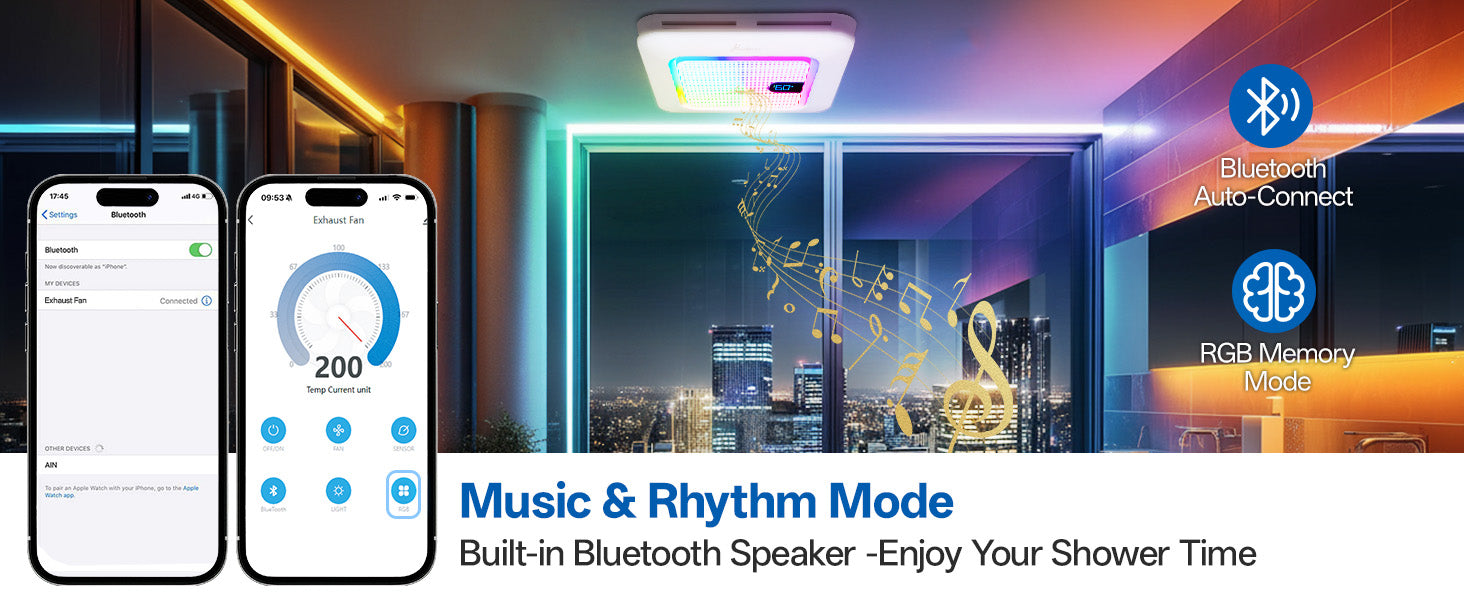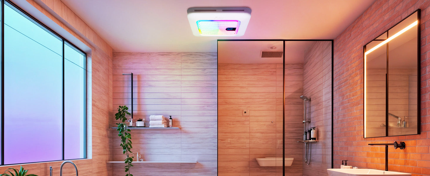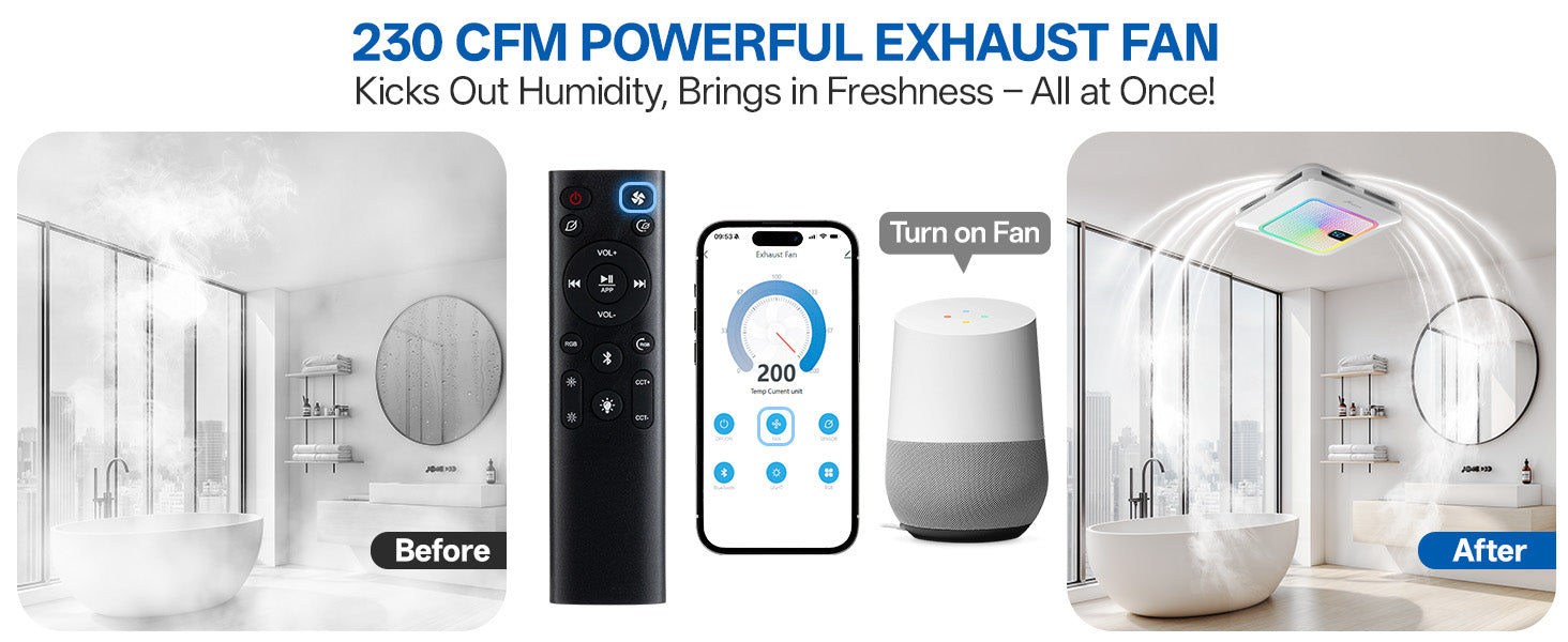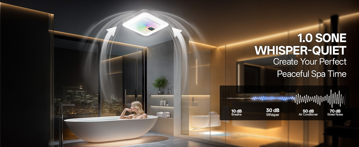 - Combines ventilation, lighting, Bluetooth sound, and smart controls into one sleek, space-saving unit. Powerful 230 CFM airflow efficiently removes moisture and odors, while the 1.0 Sone low-noise rating ensures whisper-quiet operation for a relaxing bathroom environment. An ideal upgrade for a smarter, fresher, and more stylish bathroom.