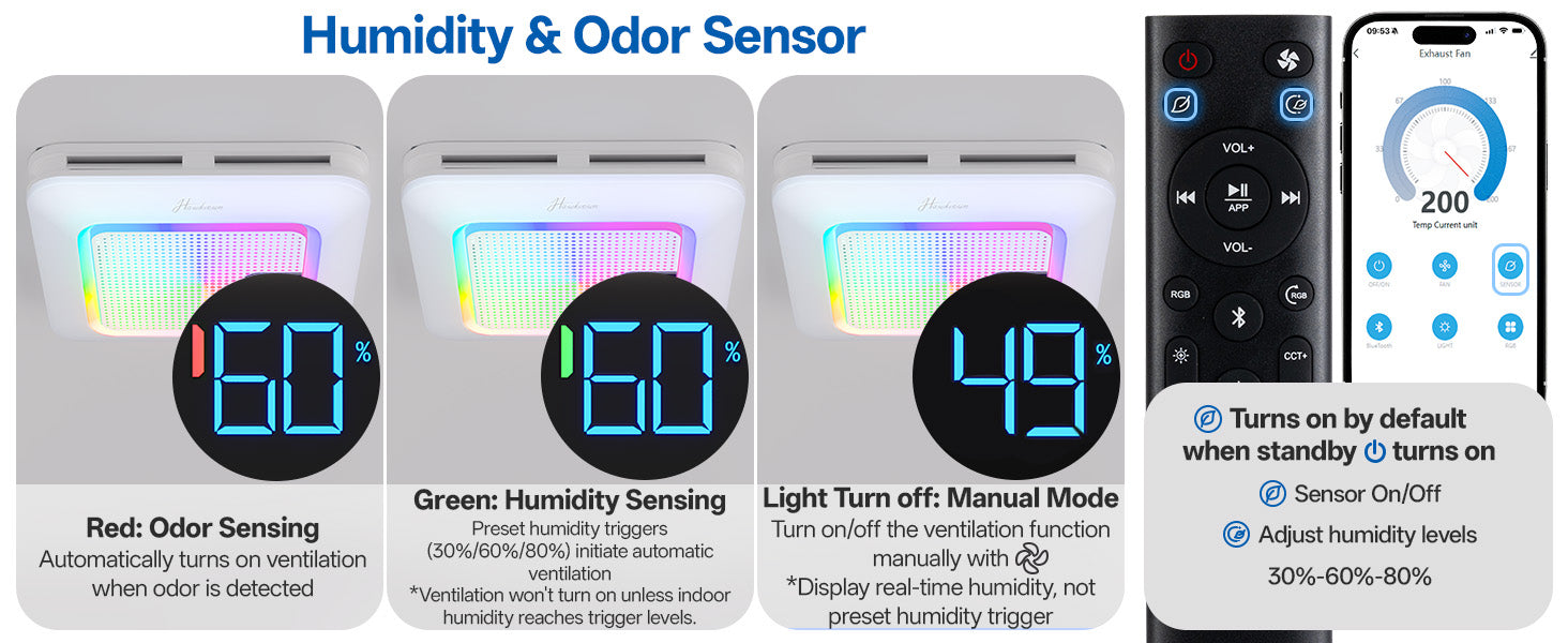 - Features dual sensors for humidity and odors. Choose between manual mode or auto-sensing mode. In auto mode, the exhasut fan activates when humidity reaches preset levels (30%, 60%, or 80%), keeping your bathroom fresh and dry. Odor detection is synchronized with humidity sensing; turning off humidity sensing also disables odor detection.