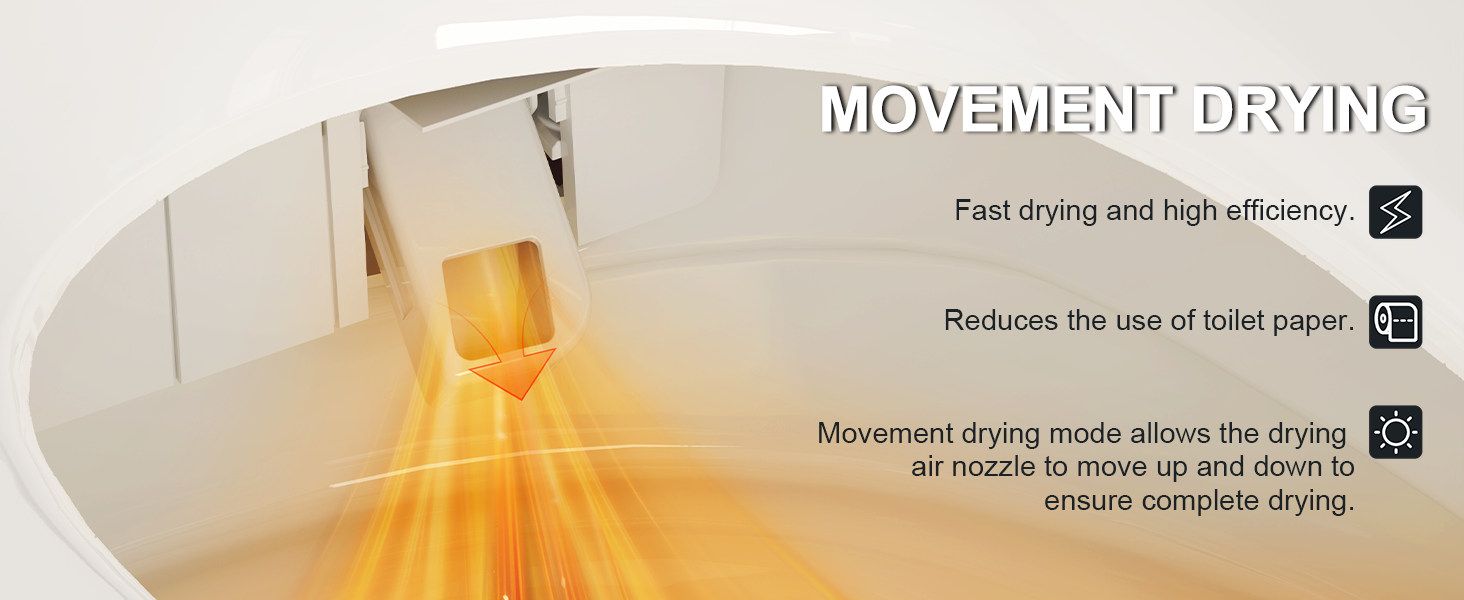 - The smart toilet has a movement drying mode where the drying air nozzle can be moved up and down to improve drying efficiency and reduce the use of toilet paper.