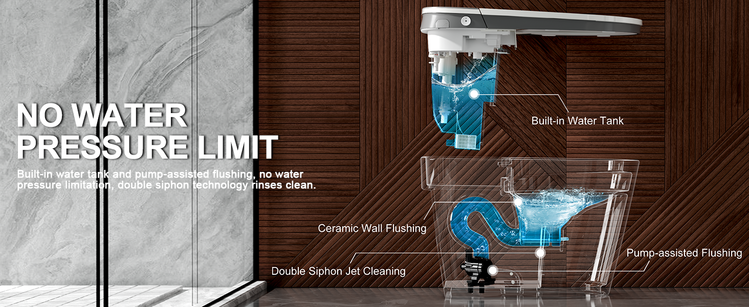 - This smart toilet with built-in tank and boost pump flushing for more stable flushing, realizing true zero water pressure suitable for homes in areas with low water pressure. The smart bidet toilet also features a double cleaning function with siphon jet flushing to ensure thorough and efficient cleaning.