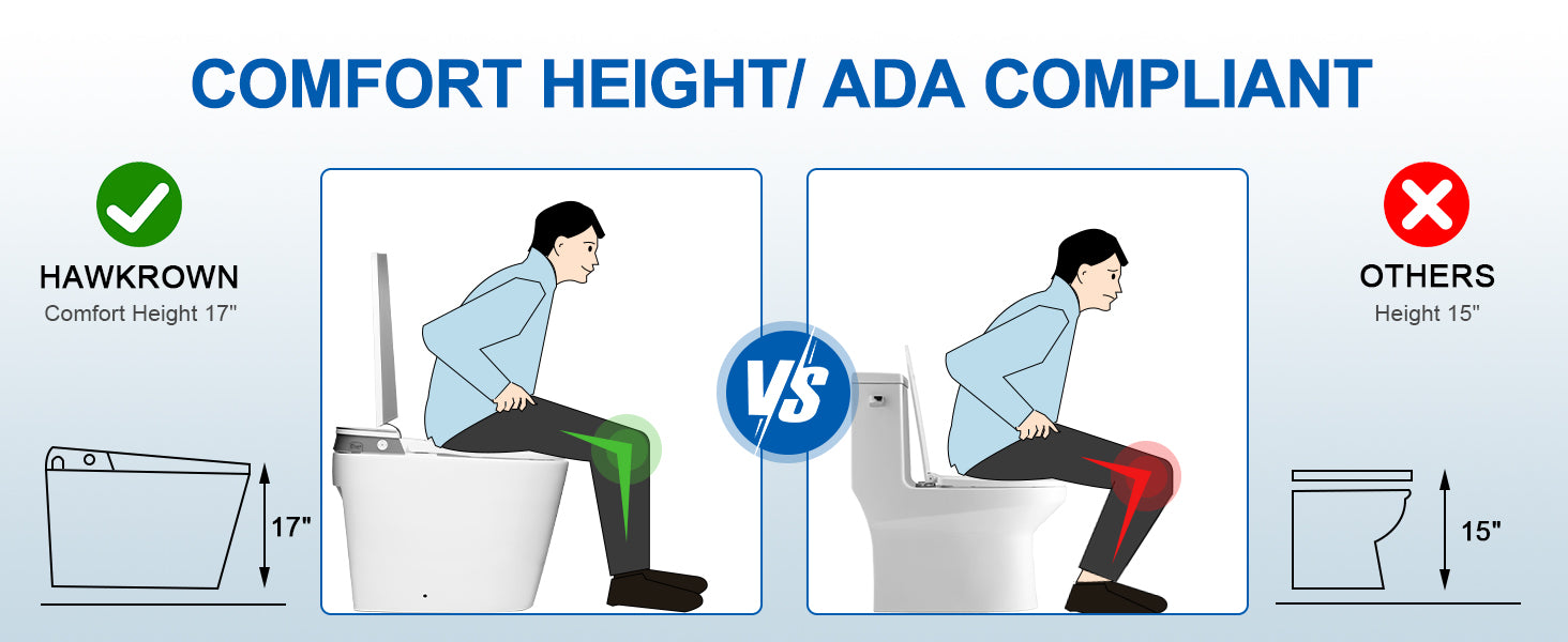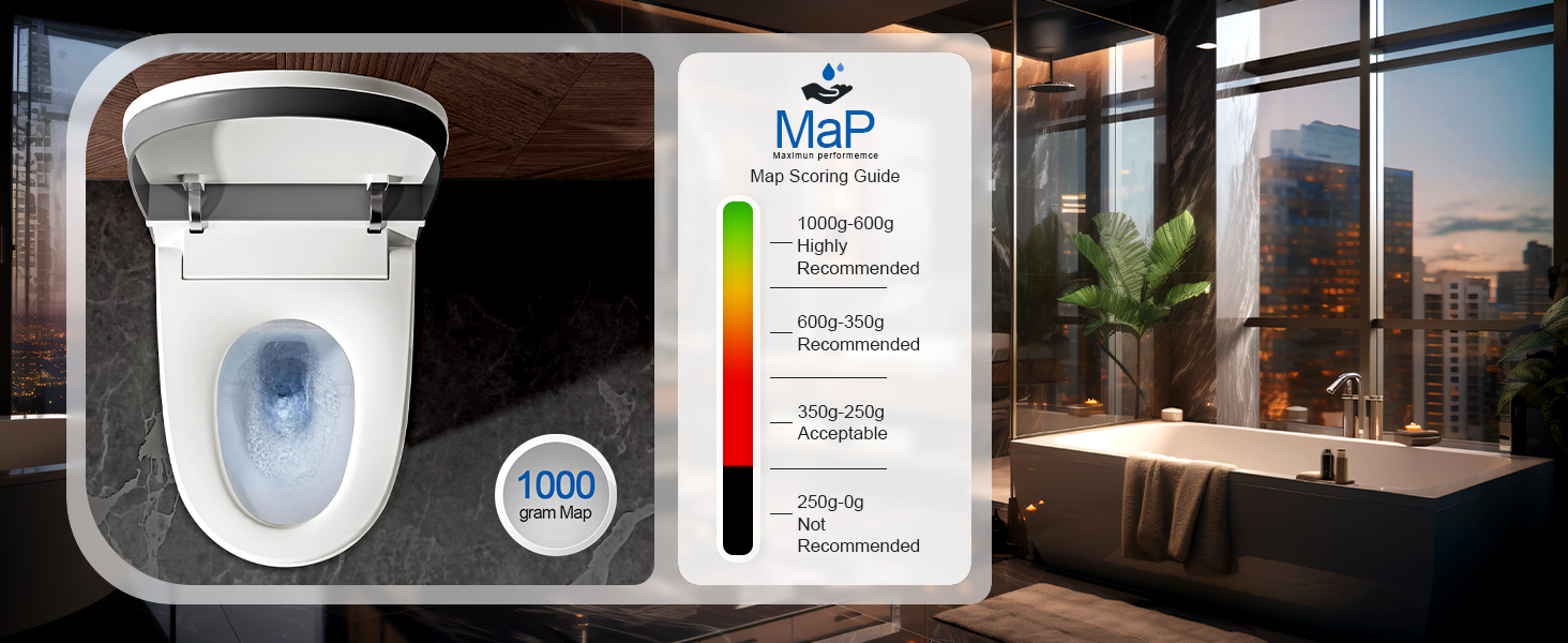 - HAWKROWN smart toilet auto dual-flush design, 1.6 GPF/6 L full-flush and 1.1 GPF/4.1 L half-flush, showcases an optimal max performance flush score of 1000 grams.
