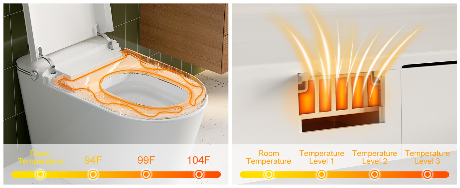 - The specially designed warm seat and powerful warm air drying function of the smart toilet allow you to enjoy instant warmth and comfort even on cold mornings or in winter. This thoughtful design makes every use of yours a pleasure.
