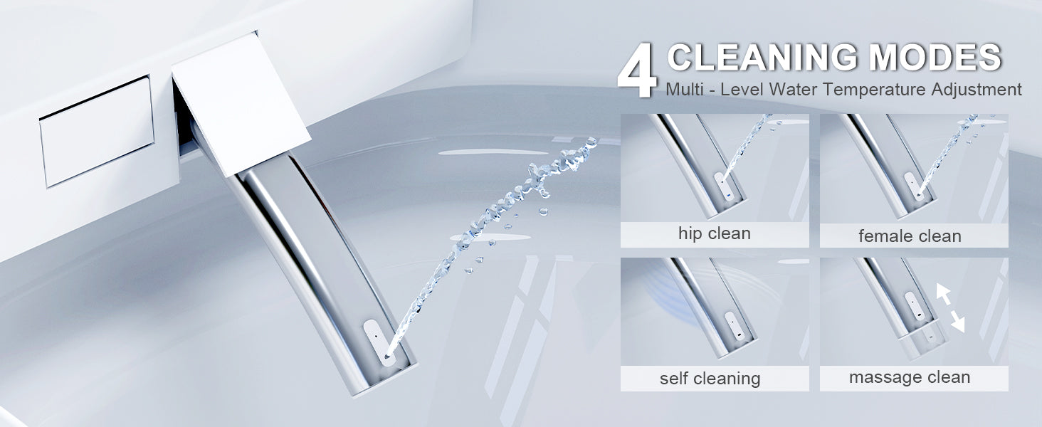 - Smart toilet curved self-cleaning nozzle provides multiple cleaning modes, including feminine cleaning, hip cleaning, pulse cleaning, and rear cleaning, etc., to meet the different needs of family members. The instant heating function ensures that both water temperature and pressure can be adjusted to bring you a personalized cleaning experience.