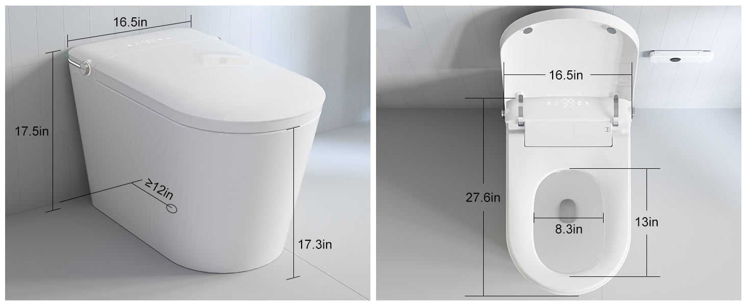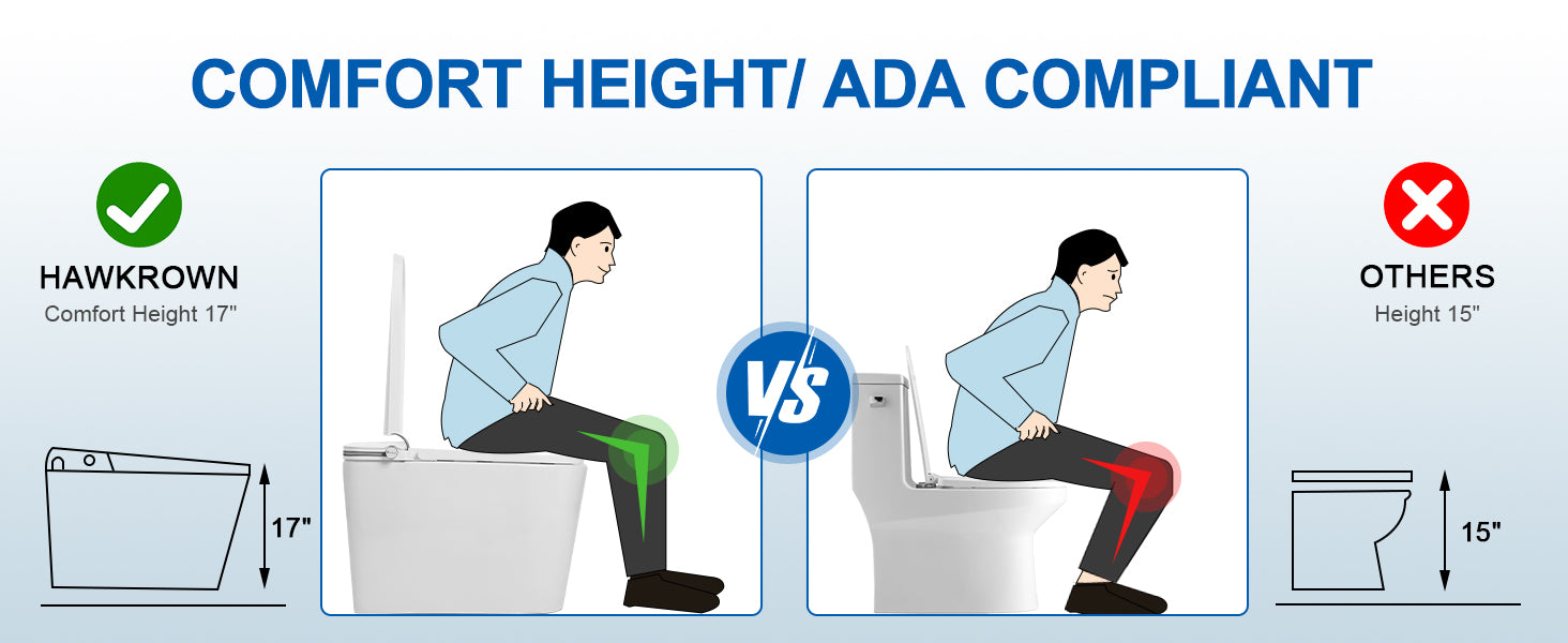 - Smart toilet with bidet built in seat is 17.3 inches high, which meets the ADA height barrier-free design standards and is particularly suitable for people with limited mobility. The raised seat reduces the physical burden when sitting down and getting up, ensuring the comfort and convenience of every user.