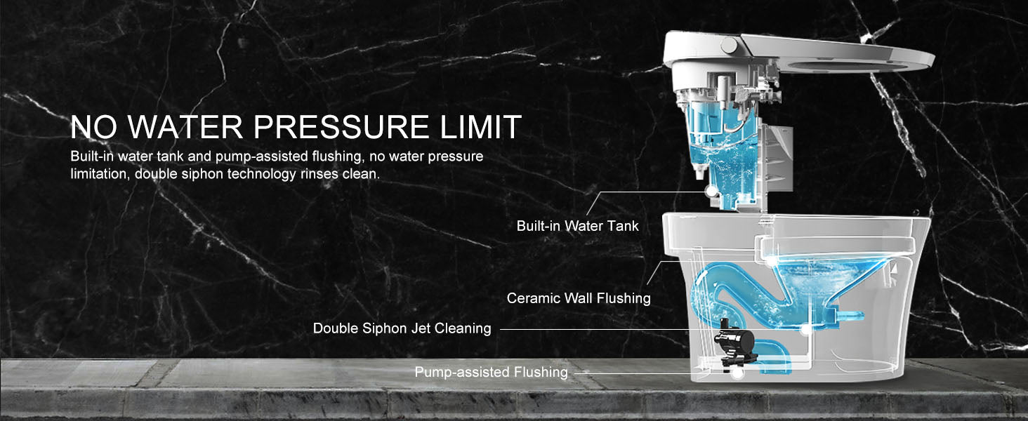 - This smart toilet with built-in tank and pump-assisted flushing for more stable flushing, realizing true zero water pressure suitable for homes in areas with low water pressure. The smart bidet toilet also features a double cleaning function with siphon jet flushing to ensure thorough and efficient cleaning.
