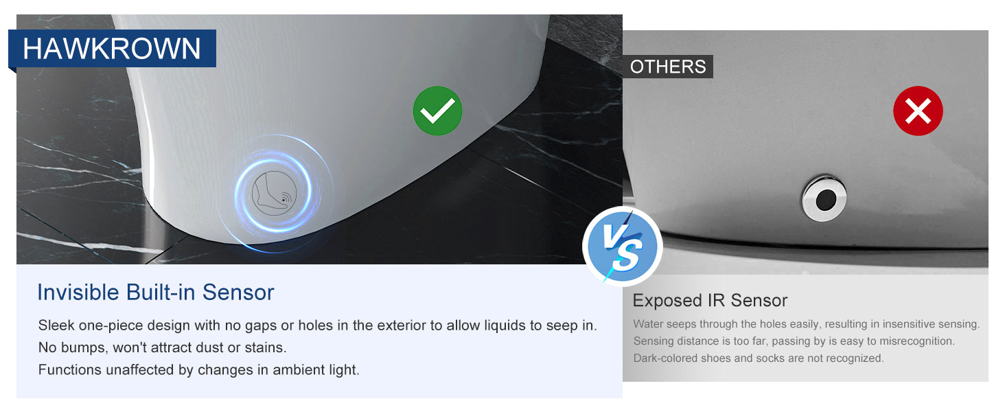 - HAWKROWN smart toilet has an intelligent design with automatic lid opening, intelligent induction heating seat, instant hot water, rinse function, warm air drying, light-sensitive night light, LED display light and remote control.